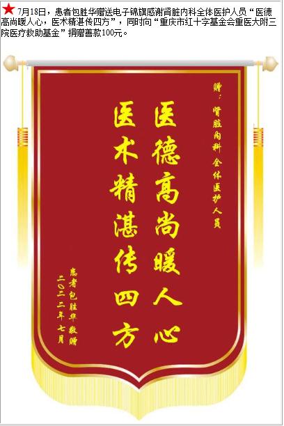 患者包胜华赠送电子锦旗感谢肾脏内科全体医护人员,并向医疗救助基金捐赠善款100元-锦旗-患者心声-患者服务-重庆医科大学附属第三医院【官方网站】
