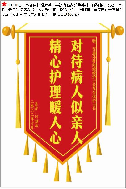 患者何桂福赠送电子锦旗感谢普通外科向媛媛护士长及全体护士长,并向医疗救助基金捐赠善款100元-锦旗-患者心声-患者服务-重庆医科大学附属第三医院【官方网站】