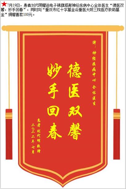 患者刘代明赠送电子锦旗感谢神经疾病中心全体医生,并向医疗救助基金捐赠善款100元-锦旗-患者心声-患者服务-重庆医科大学附属第三医院【官方网站】