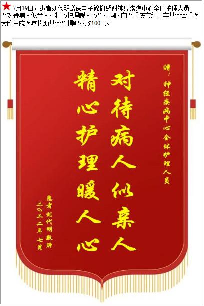 患者刘代明赠送电子锦旗感谢神经疾病中心全体护理人员,并向医疗救助基金捐赠善款100元-锦旗-患者心声-患者服务-重庆医科大学附属第三医院【官方网站】