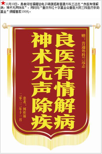 患者何桂福赠送电子锦旗感谢普通外科兰远志,并向医疗救助基金捐赠善款100元-锦旗-患者心声-患者服务-重庆医科大学附属第三医院【官方网站】