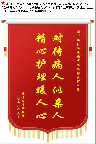 患者周守明赠送电子锦旗感谢内分泌疾病中心全体医护人员,并向医疗救助基金捐赠善款100元-锦旗-患者心声-患者服务-重庆医科大学附属第三医院【官方网站】