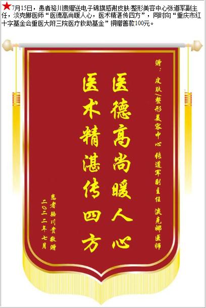 患者骆川贵赠送电子锦旗感谢皮肤/整形美容中心张道军副主任等人,并向医疗救助基金捐赠善款100元-锦旗-患者心声-患者服务-重庆医科大学附属第三医院【官方网站】