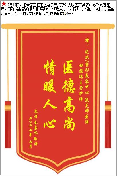 患者秦嘉忆赠送电子锦旗感谢皮肤/整形美容中心淡克娜医师等人,并向医疗救助基金捐赠善款100元-锦旗-患者心声-患者服务-重庆医科大学附属第三医院【官方网站】