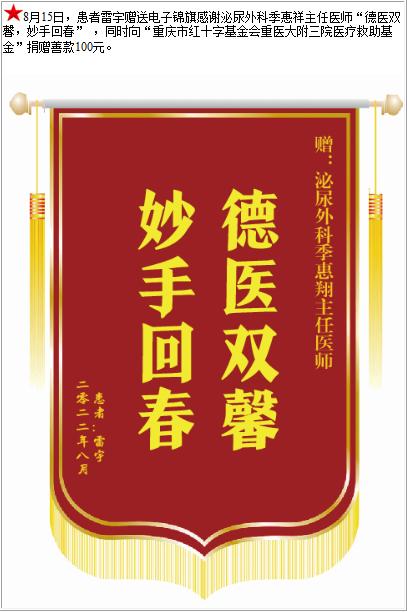 患者雷宇赠送电子锦旗感谢泌尿外科季惠祥主任医师 ,并向医疗救助基金捐赠善款100元-锦旗-患者心声-患者服务-重庆医科大学附属第三医院【官方网站】