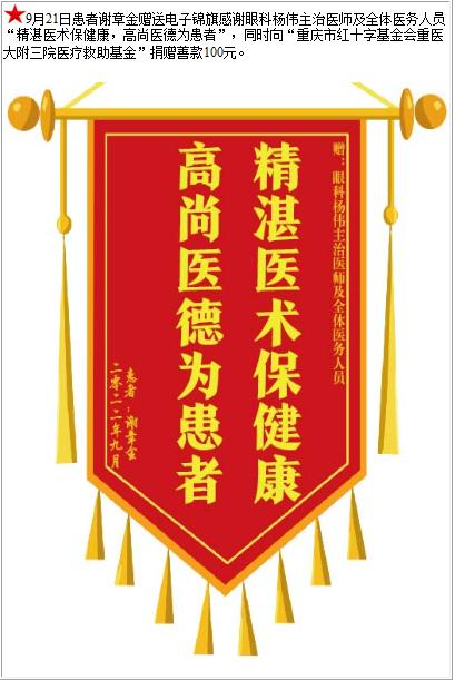 患者谢章金赠送电子锦旗感谢眼科杨伟主治医师及全体医务人员,并向医疗救助基金捐赠善款100元-锦旗-患者心声-患者服务-重庆医科大学附属第三医院【官方网站】