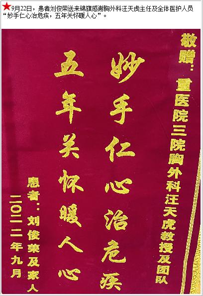 患者刘俊荣送来锦旗感谢胸外科汪天虎主任及全体医护人员“妙手仁心治危疾,五年关怀暖人心”-锦旗-患者心声-患者服务-重庆医科大学附属第三医院【官方网站】