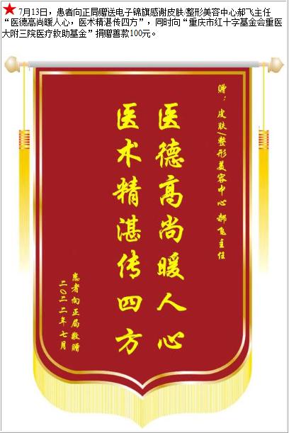 患者向正局赠送电子锦旗感谢皮肤/整形美容中心郝飞主任,并向医疗救助基金捐赠善款100元-锦旗-患者心声-患者服务-重庆医科大学附属第三医院【官方网站】