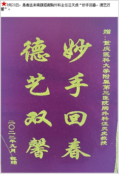 患者送来锦旗感谢胸外科主任汪天虎“妙手回春,德艺双馨”-锦旗-患者心声-患者服务-重庆医科大学附属第三医院【官方网站】