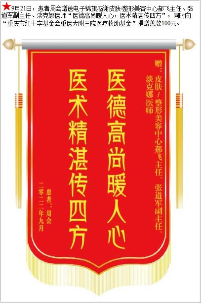 患者周会赠送电子锦旗感谢皮肤/整形美容中心郝飞主任等人,并向医疗救助基金捐赠善款100元-锦旗-患者心声-患者服务-重庆医科大学附属第三医院【官方网站】