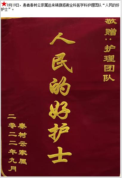 患者秦树云家属送来锦旗感谢全科医学科护理团队“人民的好护士”