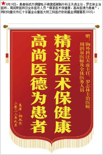 患者杨成杰捐赠电子锦旗感谢胸外科汪天虎主任等人及全体医务人员,并向医疗救助基金捐赠善款200元-锦旗-患者心声-患者服务-重庆医科大学附属第三医院【官方网站】