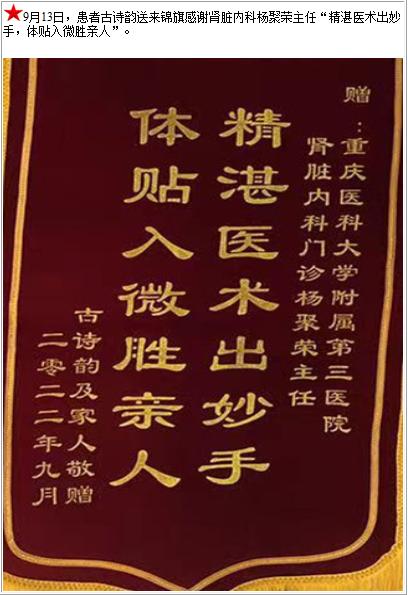 患者古诗韵送来锦旗感谢肾脏内科杨聚荣主任“精湛医术出妙手,体贴入微胜亲人”-锦旗-患者心声-患者服务-重庆医科大学附属第三医院【官方网站】