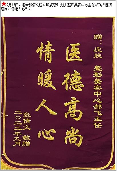 患者张倩文送来锦旗感谢皮肤/整形美容中心主任郝飞“医德高尚,情暖人心”-锦旗-患者心声-患者服务-重庆医科大学附属第三医院【官方网站】