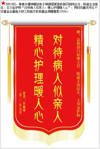 患者许耀坤赠送电子锦旗感谢急救部闫柏刚主任等人,并向医疗救助基金捐赠善款100元-锦旗-患者心声-患者服务-重庆医科大学附属第三医院【官方网站】