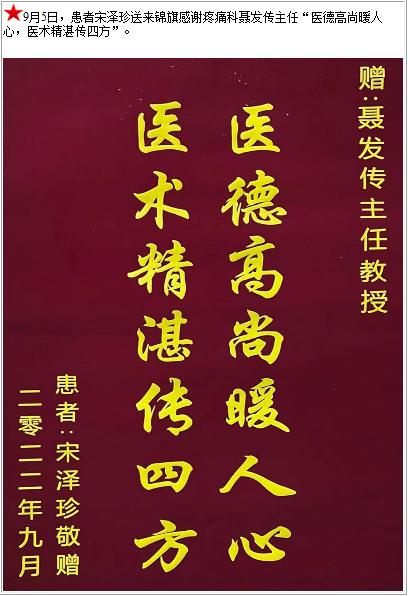 患者宋泽珍送来锦旗感谢疼痛科聂发传主任“医德高尚暖人心,医术精湛传四方”