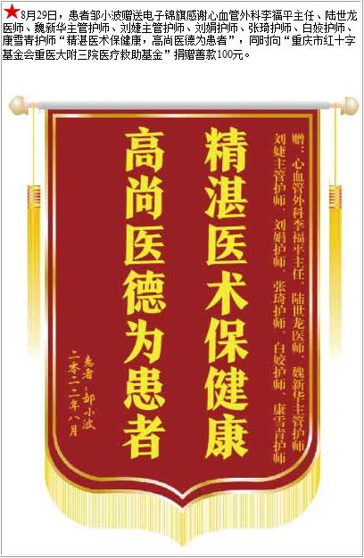 患者邹小波赠送电子锦旗感谢心血管外科李福平主任等人,并向医疗救助基金捐赠善款100元-锦旗-患者心声-患者服务-重庆医科大学附属第三医院【官方网站】