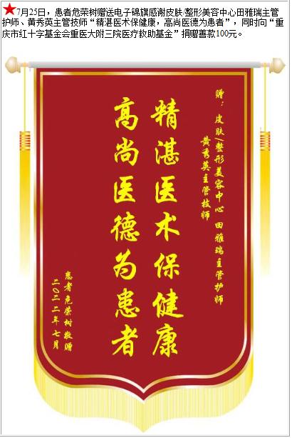 患者危荣树赠送电子锦旗感谢皮肤/整形美容中心田雅瑞主管护师等人,并向医疗救助基金捐赠善款100元-锦旗-患者心声-患者服务-重庆医科大学附属第三医院【官方网站】
