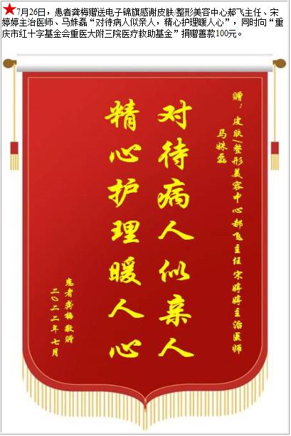 患者龚梅赠送电子锦旗感谢皮肤/整形美容中心郝飞主任等人,并向医疗救助基金捐赠善款100元-锦旗-患者心声-患者服务-重庆医科大学附属第三医院【官方网站】