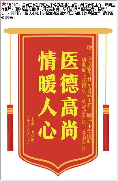 患者王学勤赠送电子锦旗感谢心血管内科司良毅主任等人,并向医疗救助基金捐赠善款100元-锦旗-患者心声-患者服务-重庆医科大学附属第三医院【官方网站】