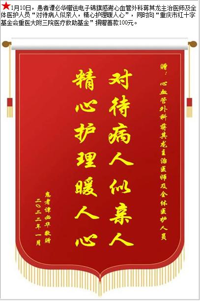 患者谭必华赠送电子锦旗感谢心血管外科蒋其龙主治医师及全体医护人员,并向医疗救助基金捐赠善款100元-锦旗-患者心声-患者服务-重庆医科大学附属第三医院【官方网站】