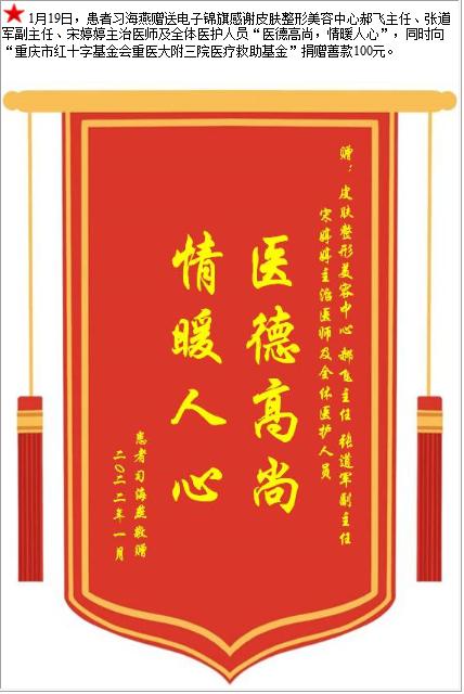患者习海燕赠送电子锦旗感谢皮肤整形美容中心郝飞主任等人及全体医护人员,并向医疗救助基金捐赠善款100元-锦旗-患者心声-患者服务-重庆医科大学附属第三医院【官方网站】