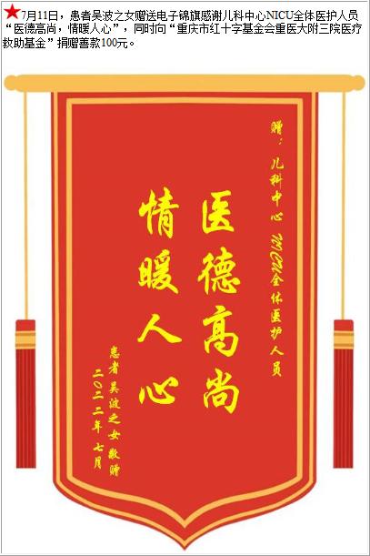 患者吴波之女赠送电子锦旗感谢儿科中心NICU全体医护人员,并向医疗救助基金捐赠善款100元-锦旗-患者心声-患者服务-重庆医科大学附属第三医院【官方网站】