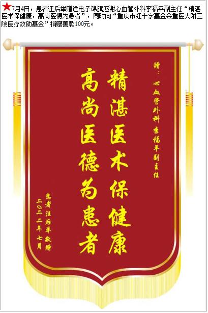 患者汪后举赠送电子锦旗感谢心血管外科李福平副主任,并向医疗救助基金捐赠善款100元-锦旗-患者心声-患者服务-重庆医科大学附属第三医院【官方网站】