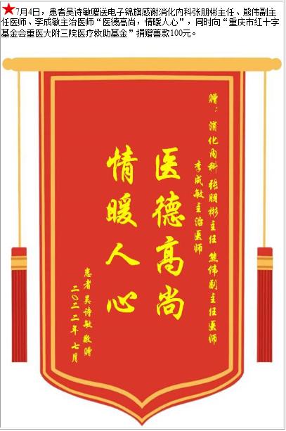 患者吴诗敏赠送电子锦旗感谢消化内科张朋彬主任等人,并向医疗救助基金捐赠善款100元-锦旗-患者心声-患者服务-重庆医科大学附属第三医院【官方网站】