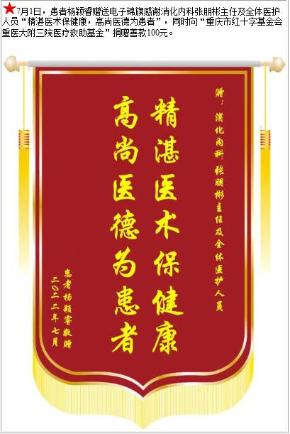 患者杨颖睿赠送电子锦旗感谢消化内科张朋彬主任及全体医护人员,并向医疗救助基金捐赠善款100-锦旗-患者心声-患者服务-重庆医科大学附属第三医院【官方网站】
