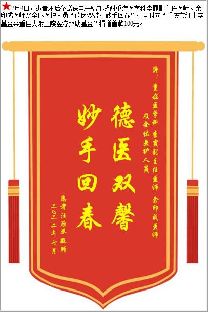 患者汪后举赠送电子锦旗感谢重症医学科李霞副主任医师等人及全体医护人员,并向医疗救助基金捐赠善款100元-锦旗-患者心声-患者服务-重庆医科大学附属第三医院【官方网站】