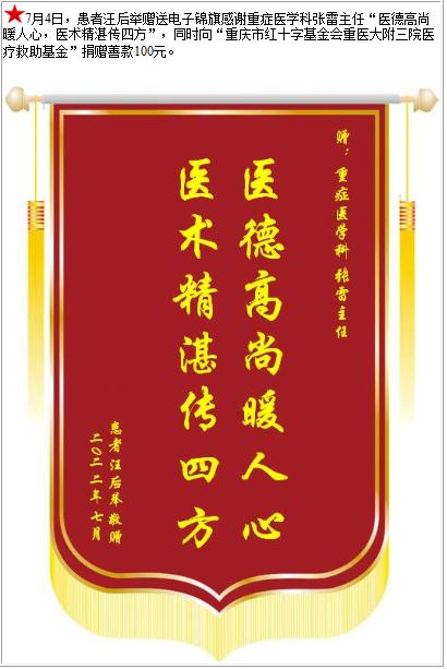患者汪后举赠送电子锦旗感谢重症医学科张雷主任,并向医疗救助基金捐赠善款100元-锦旗-患者心声-患者服务-重庆医科大学附属第三医院【官方网站】