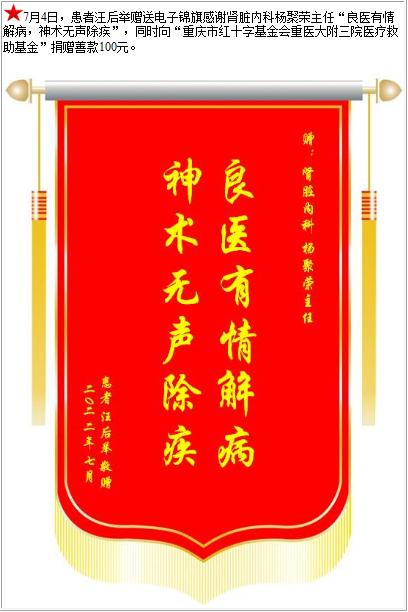 患者汪后举赠送电子锦旗感谢肾脏内科杨聚荣主任,并向医疗救助基金捐赠善款100元-锦旗-患者心声-患者服务-重庆医科大学附属第三医院【官方网站】