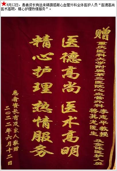 患者资长有送来锦旗感谢心血管外科全体医护人员“医德高尚医术高明,精心护理热情服务”-锦旗-患者心声-患者服务-重庆医科大学附属第三医院【官方网站】