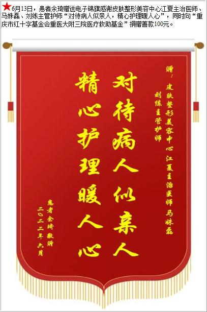 患者余琦赠送电子锦旗感谢皮肤整形美容中心江夏主治医师等人,并向医疗救助基金捐赠善款100元-锦旗-患者心声-患者服务-重庆医科大学附属第三医院【官方网站】
