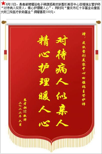 患者郝珺赠送电子锦旗感谢皮肤整形美容中心田雅瑞主管护师,并向医疗救助基金捐赠善款100元-锦旗-患者心声-患者服务-重庆医科大学附属第三医院【官方网站】