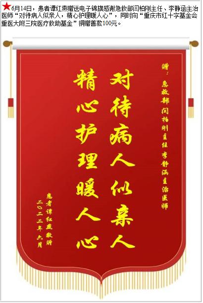 患者谭红燕赠送电子锦旗感谢急救部闫柏刚主任等人,并向医疗救助基金捐赠善款100元-锦旗-患者心声-患者服务-重庆医科大学附属第三医院【官方网站】