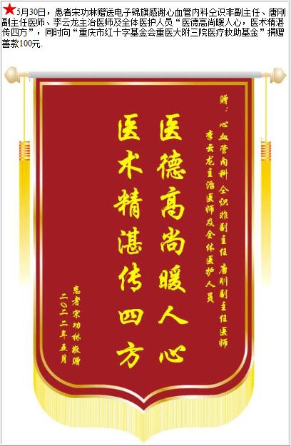患者宋功林赠送电子锦旗感谢心血管内科仝识非副主任等人及全体医护人员,并向医疗救助基金捐赠善款100元-锦旗-患者心声-患者服务-重庆医科大学附属第三医院【官方网站】
