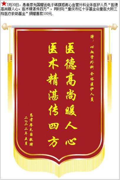 患者廖先国赠送电子锦旗感谢心血管外科全体医护人员,并向医疗救助基金捐赠善款100元-锦旗-患者心声-患者服务-重庆医科大学附属第三医院【官方网站】