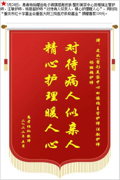 患者杨灿赠送电子锦旗感谢皮肤/整形美容中心田雅瑞主管护师等人,并向医疗救助基金捐赠善款100元-锦旗-患者心声-患者服务-重庆医科大学附属第三医院【官方网站】