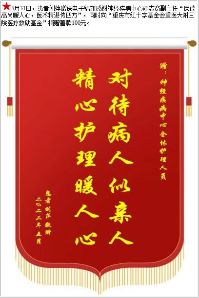 患者刘萍赠送电子锦旗感谢神经疾病中心邓志宽副主任,并向医疗救助基金捐赠善款100元-锦旗-患者心声-患者服务-重庆医科大学附属第三医院【官方网站】