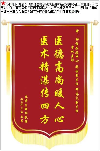 患者李明杨赠送电子锦旗感谢神经疾病中心张云东主任等人,并向医疗救助基金捐赠善款100元-锦旗-患者心声-患者服务-重庆医科大学附属第三医院【官方网站】