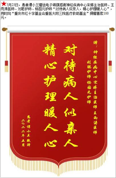 患者谭小兰赠送电子锦旗感谢神经疾病中心宋婷主治医师等人,并向医疗救助基金捐赠善款100元-锦旗-患者心声-患者服务-重庆医科大学附属第三医院【官方网站】