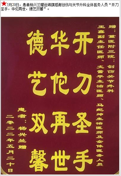 患者杨兴兰赠送锦旗感谢创伤与关节外科全体医务人员“开刀圣手,华佗再世,德艺双馨”-锦旗-患者心声-患者服务-重庆医科大学附属第三医院【官方网站】