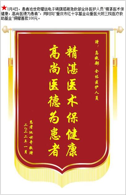 患者池世奇赠送电子锦旗感谢急救部全体医护人员,并向医疗救助基金捐赠善款100元-锦旗-患者心声-患者服务-重庆医科大学附属第三医院【官方网站】