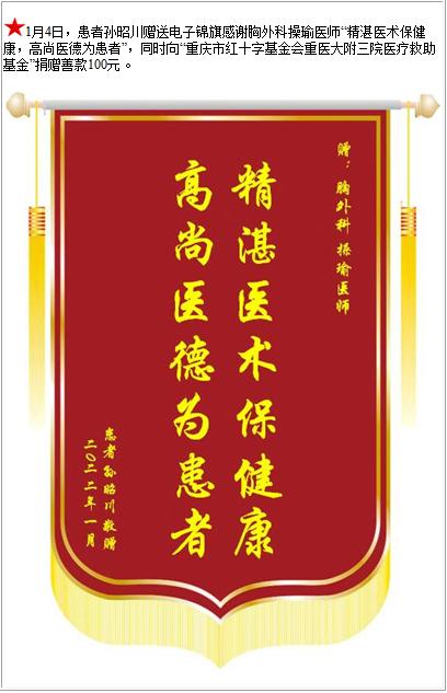 患者孙昭川赠送电子锦旗感谢胸外科操瑜医师,并向医疗救助基金捐赠善款100元-锦旗-患者心声-患者服务-重庆医科大学附属第三医院【官方网站】