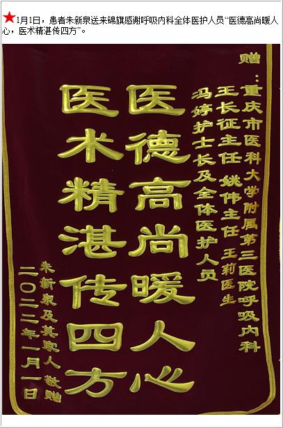 患者朱新泉送来锦旗感谢呼吸内科全体医护人员“医德高尚暖人心,医术精湛传四方”-锦旗-患者心声-患者服务-重庆医科大学附属第三医院【官方网站】
