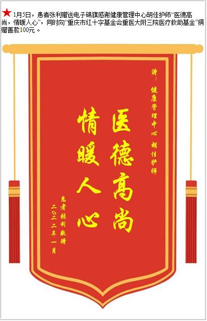患者张利赠送电子锦旗感谢健康管理中心胡佳护师,并向医疗救助基金捐赠善款100元-锦旗-患者心声-患者服务-重庆医科大学附属第三医院【官方网站】
