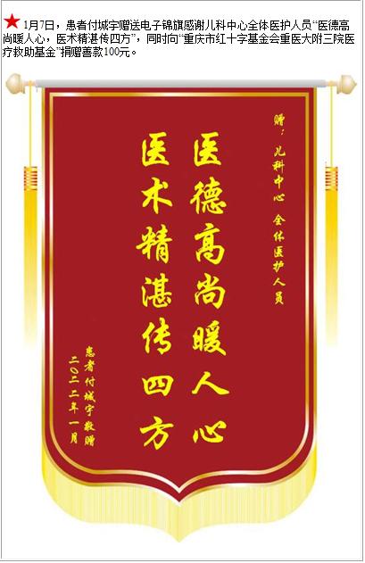 患者付城宇赠送电子锦旗感谢儿科中心全体医护人员,并向医疗救助基金捐赠善款100元-锦旗-患者心声-患者服务-重庆医科大学附属第三医院【官方网站】