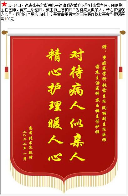 患者张书定赠送电子锦旗感谢重症医学科张雷主任等人,并向医疗救助基金捐赠善款100元-锦旗-患者心声-患者服务-重庆医科大学附属第三医院【官方网站】
